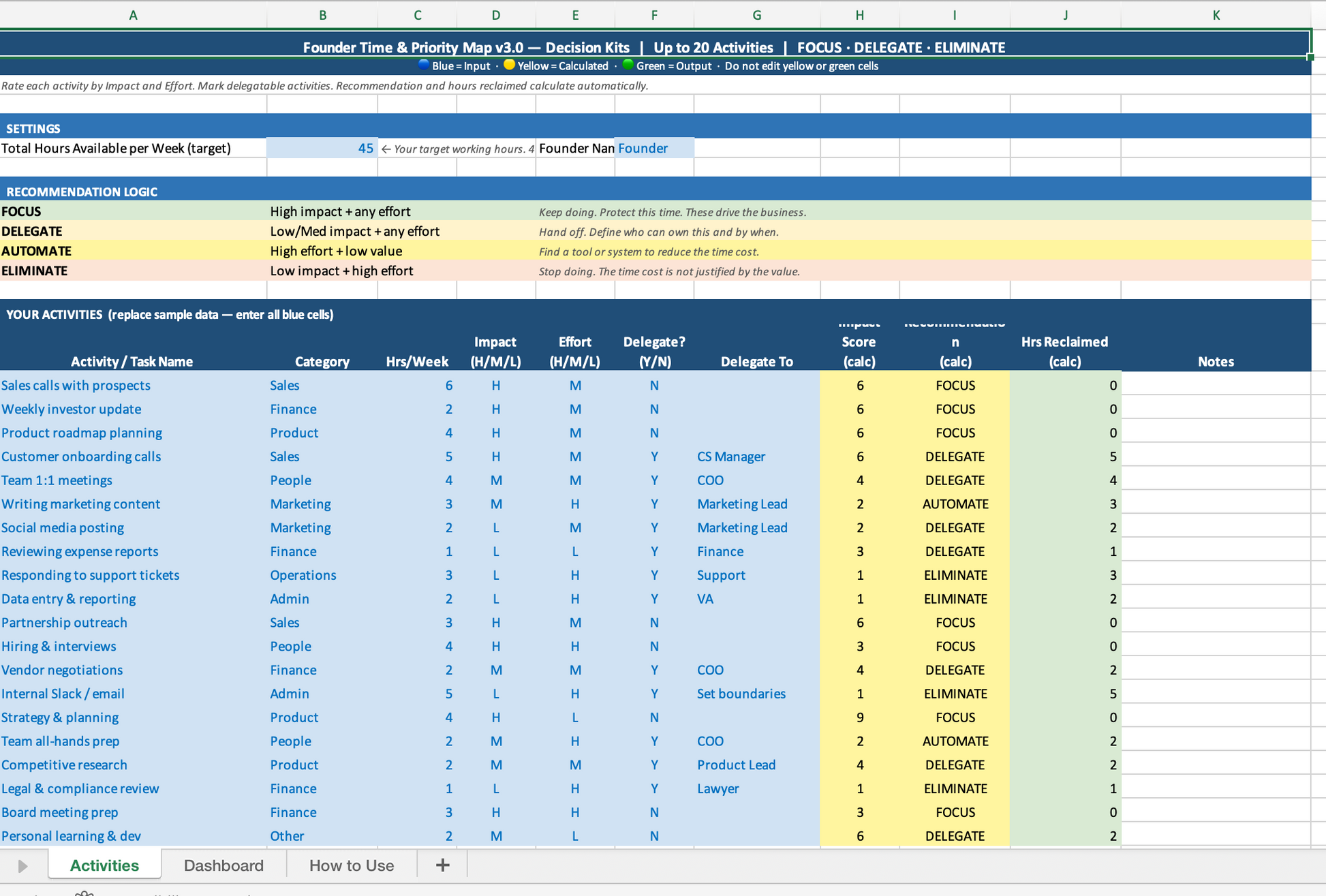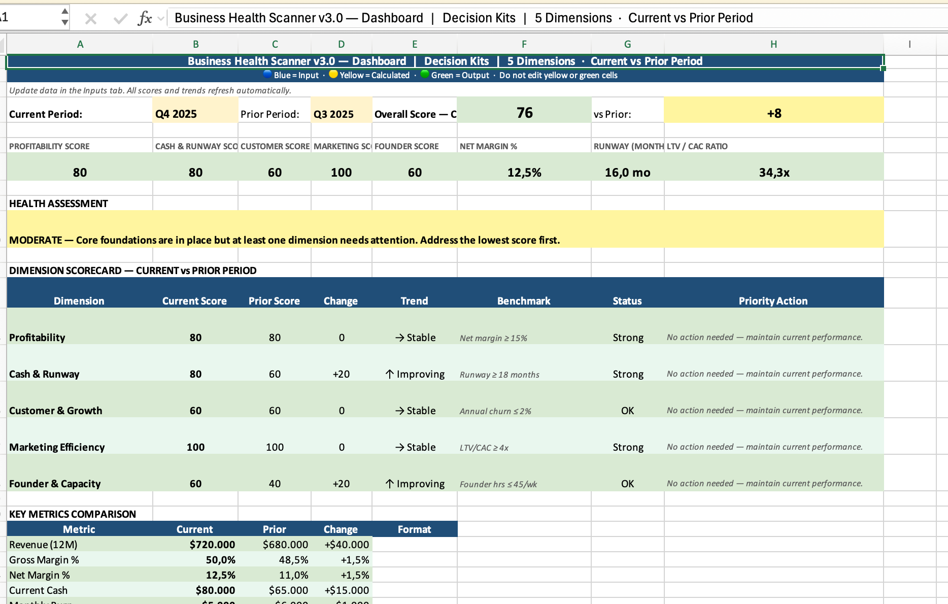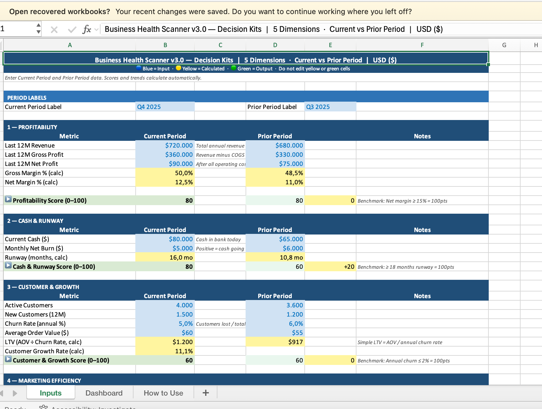 Every template follows the DecisionKits structure — Blue Inputs, Yellow Calculations, Green Outputs.